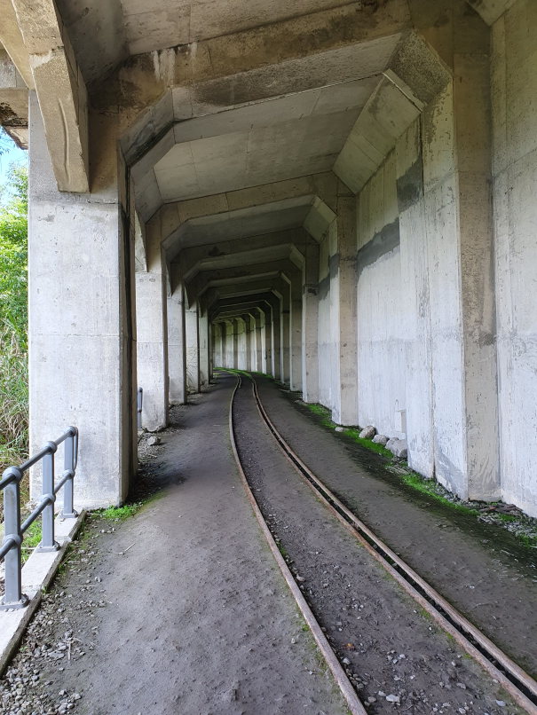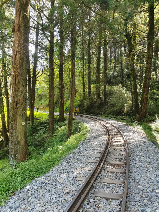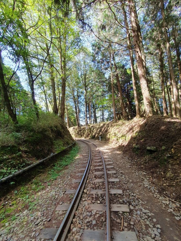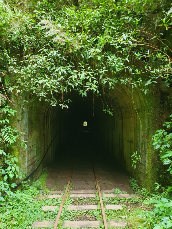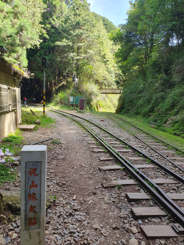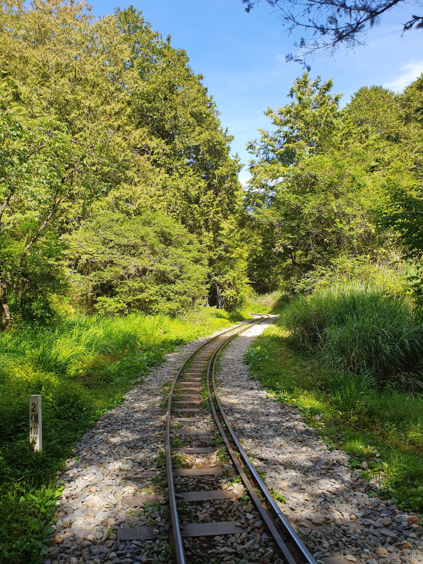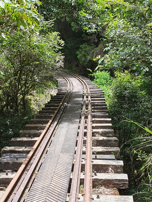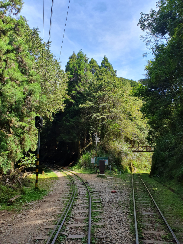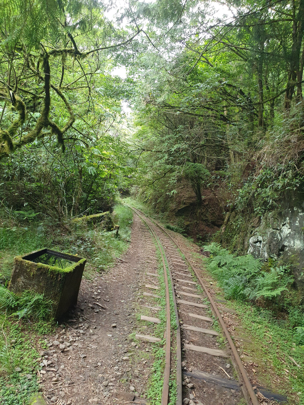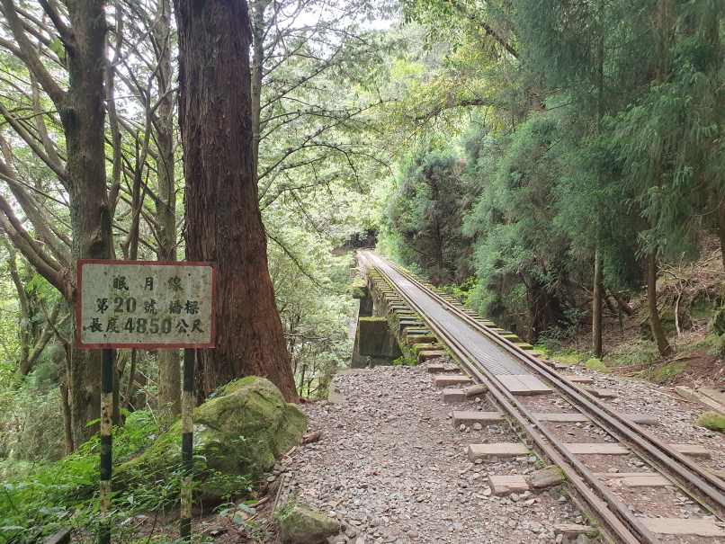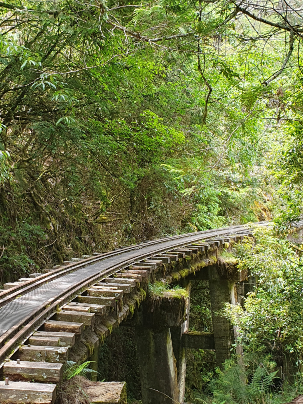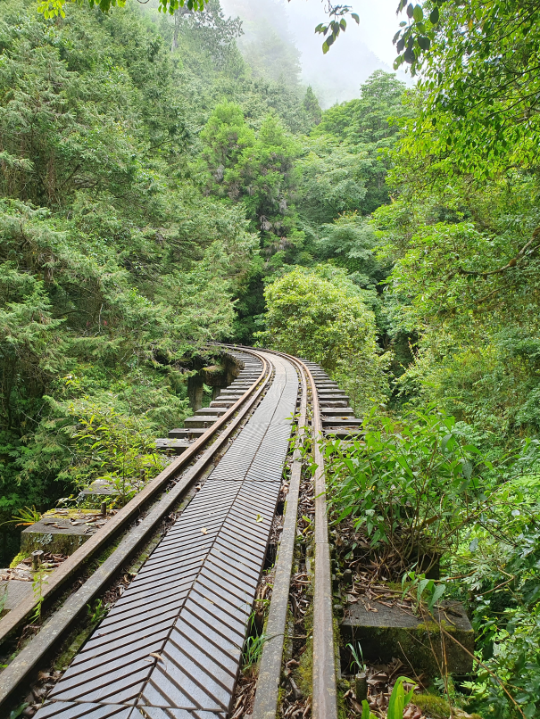 森林中廢棄鐵道, 起霧時彷彿童話般的秘境景點, 初次造訪時艷陽高照, 光走到姊妹潭就趕緊換成薄外套才能繼續, 但寧願碰到好天氣也不想遇雨狼狽前行, 尤其途中幾個隧道下雨時可能會變水簾洞, 只能單向通行的鐵道橋在雨天也有踩滑風險, 雖說已經廢棄無火車通行, 但管理單位還是持續有在整修, 鋪設更換鐵軌間木板, 走起來很穩固, 除了前段的崩塌處需要拉繩上下外, 其他都是平緩路線, 沒什麼在運動的家人也可以走完全程; 路線終點的石猴車站沒什麼特色, 看點在於途中的各式鐵道橋, 林間的鐵軌, 隧道及崩塌處, 雖說是連假, 遊客其實不多,可以盡情拍風景照, 但碰到好幾組全副武裝隊伍, 也看到兩三組紮營, 或許是要再進去往水漾森林