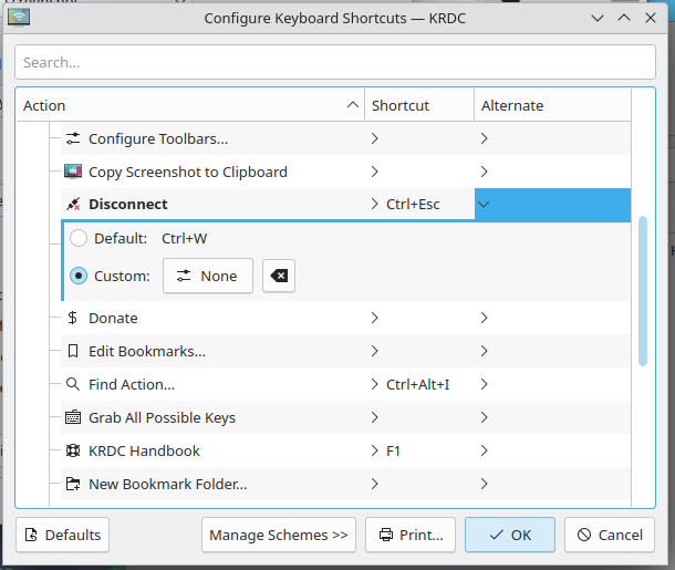 有時下班後或假日會遠端連線回辦公室電腦處理公事, 目前使用 KDE 內建的 KRDC, 但跟 Windows 的遠端桌面連線程式比起來, 有一點不習慣的是 Ctrl + w 會關閉目前連線的視窗, 得再重新連線登入, 偏偏我很常使用這個快捷鍵來關閉 Firefox 分頁或 PDF Reader 頁籤, 幾乎每次都會踩到這個問題, 搜尋了一下, 本以為是 KDE 自己的快捷鍵設定, 搞了好幾天, 還去新增 KDE 的 Windows Rules, 後來才發現是 KRDC 自己的斷線快捷鍵設定, 調整一下就沒這問題.